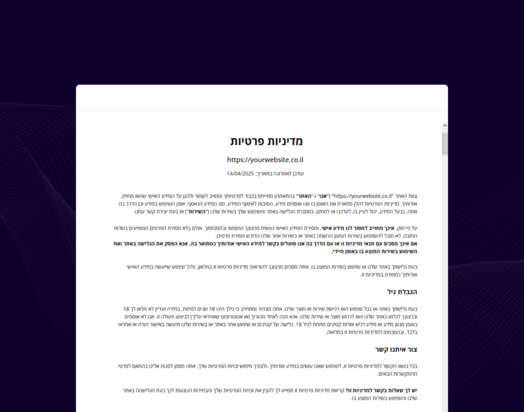 מחולל המדיניות שלנו יעזור לכם ליצור מדיניות מקיפה ומדויקת לאתר שלכם.